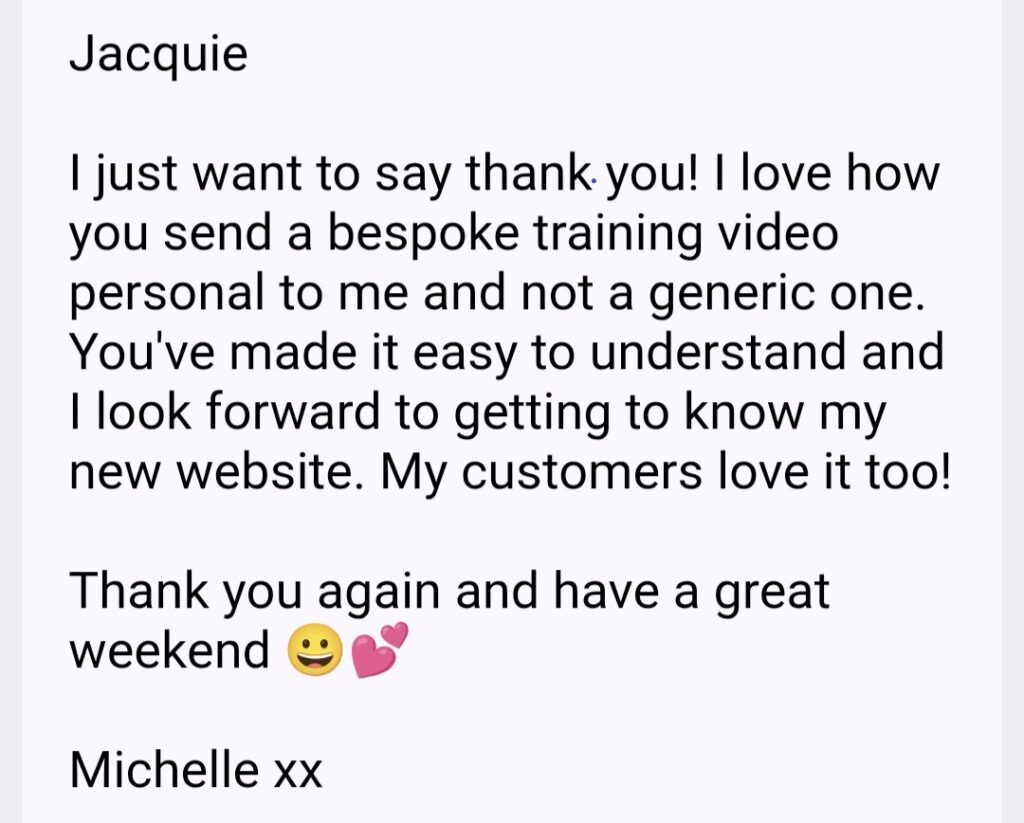 “Great service and communication from Jacquie in creating my new website. I am absolutely delighted with it. Highly recommended.”